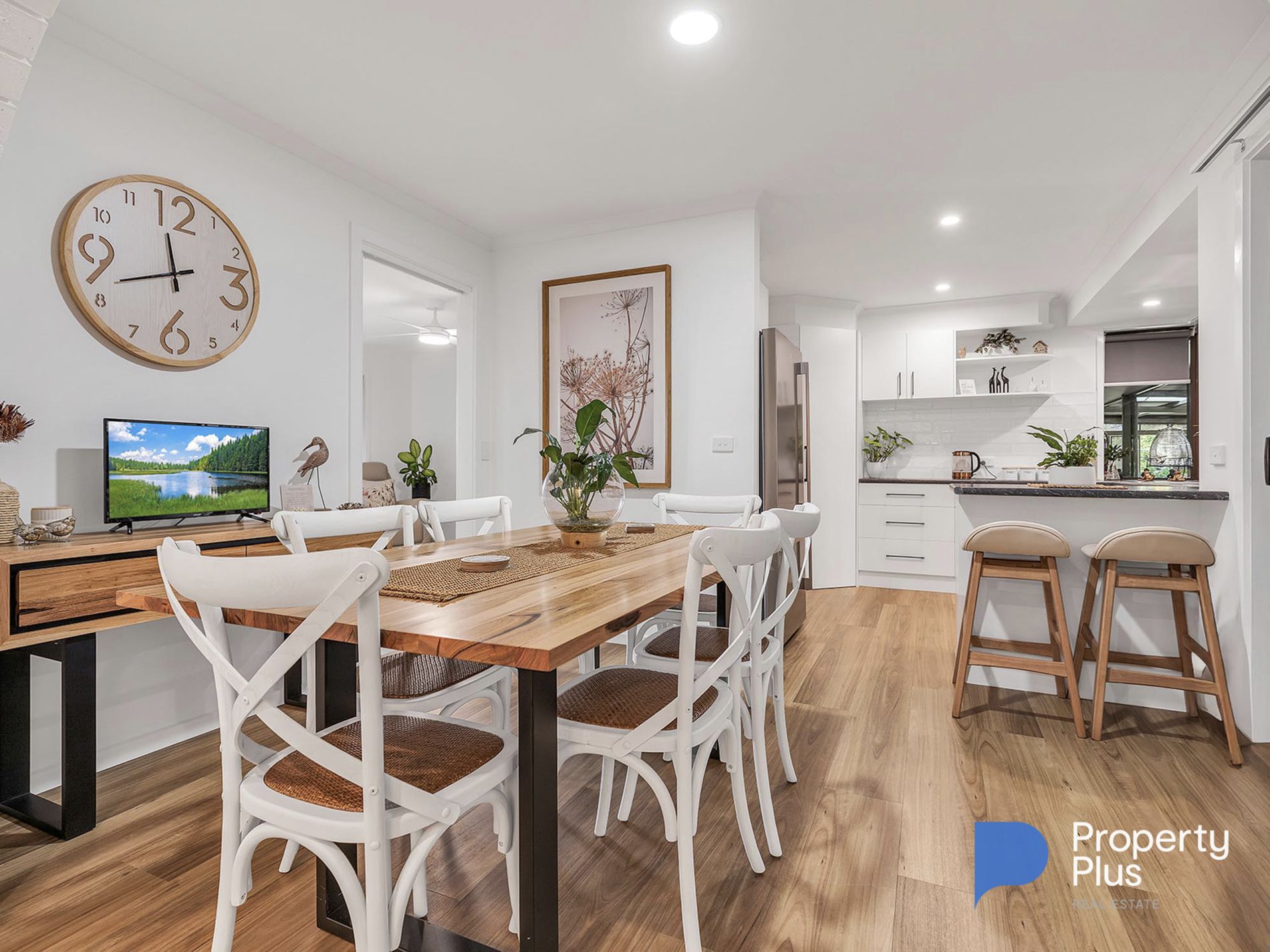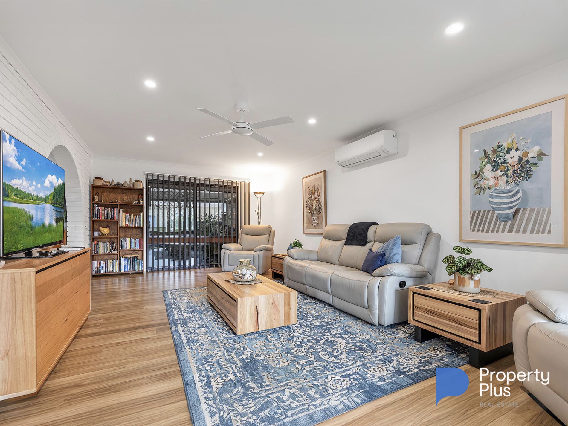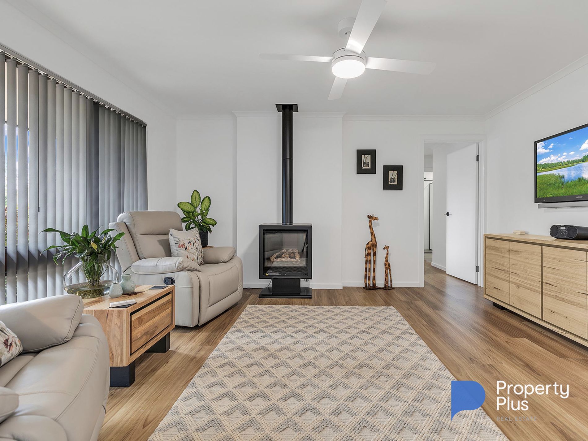 The main lounge boasts a ceiling fan, vertical blinds and a split system for comfort year-round. The beautiful modern kitchen offers plenty of bench space, huge pantry and ample storage, equipped with a gas cooktop, electric oven, dishwasher, breakfast bar and corner pantry overlooking a spacious dining area with sliding doors leading to an inviting outdoor entertaining space. There is also a second formal lounge, a gas log heater and a ceiling fan creating a warm atmosphere for cosy gatherings in the cooler months.