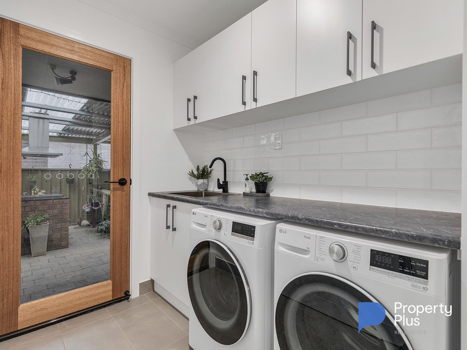 The master bedroom is designed for relaxation, complete with carpeted flooring, a ceiling fan, air conditioner, a walk-through wardrobe and an ensuite with shower and vanity. Bedrooms 2, 3, and 4 are also carpeted, each with ceiling fans and built-in wardrobes. The spacious main bathroom includes a bath, shower and a separate toilet. The well-equipped laundry features cabinetry and access to the outdoors.
