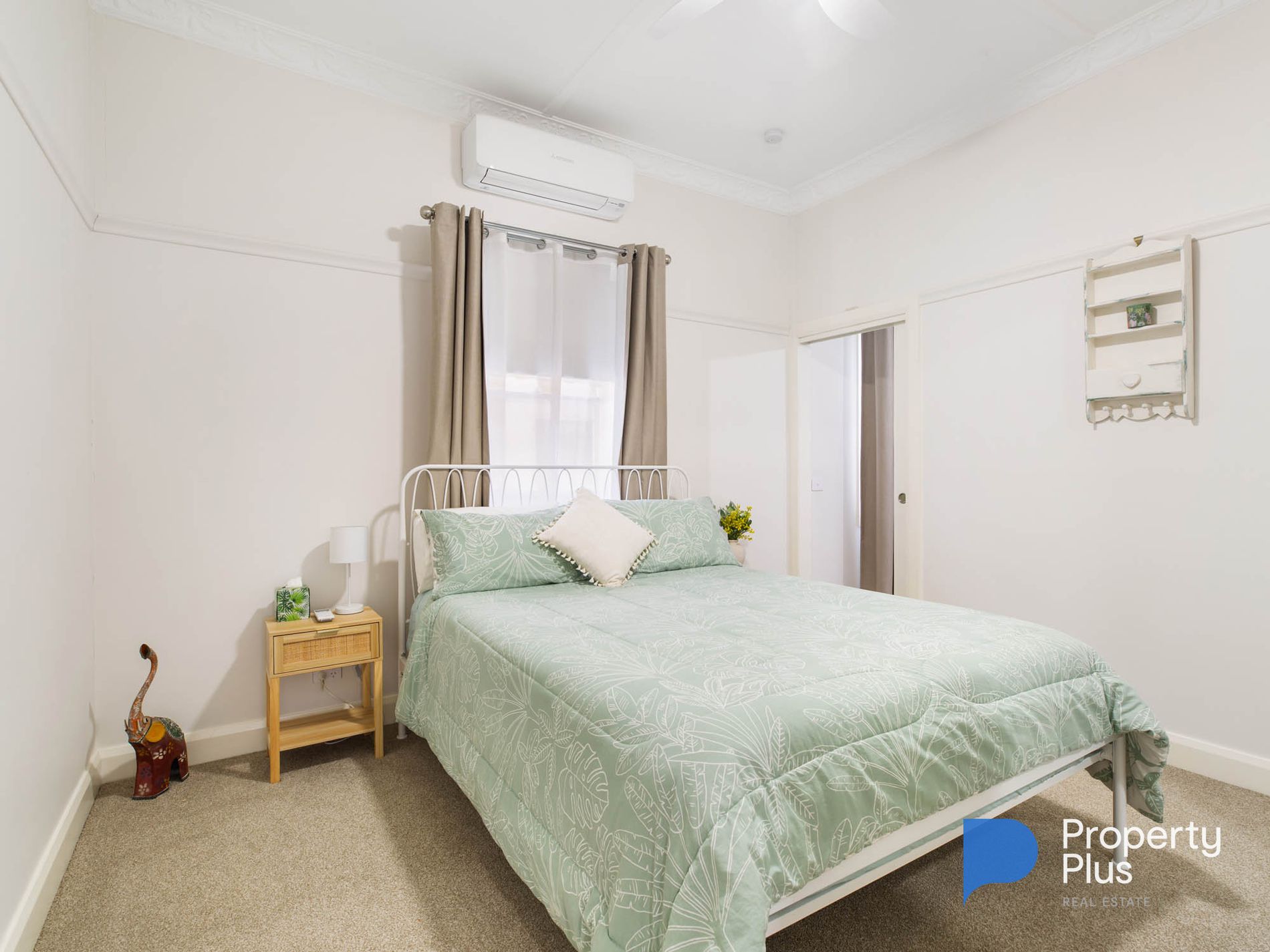 The master bedroom is a true retreat, boasting triple built-in robes, split system heating and cooling and exquisite plaster details that exude sophistication. The spacious second bedroom comes equipped with dual built-in robes and thoughtfully matched amenities, while the third bedroom offers versatile access - connecting conveniently to the second room and featuring a separate outside entry, ideal for a home office. The stylish bathroom showcases a large shower, a well-appointed vanity with storage and chic plank flooring, paired with a practical laundry area.