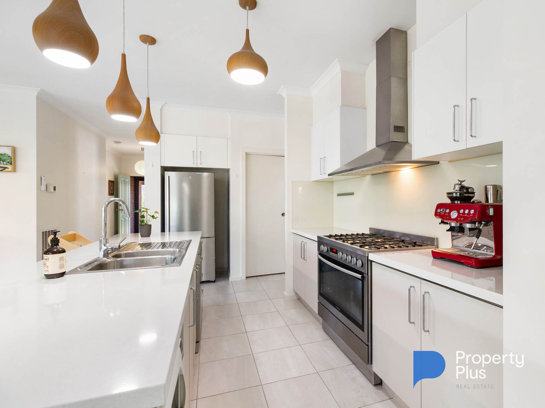 At the heart of the home lies a bright, open-plan kitchen, living and dining zone bathed in natural light - an ideal setting for easy family living. The kitchen pairs modern design with practicality, offering a generous walk-in pantry, sleek finishes and stylish timber-look overhead lighting that adds warmth and sophistication.