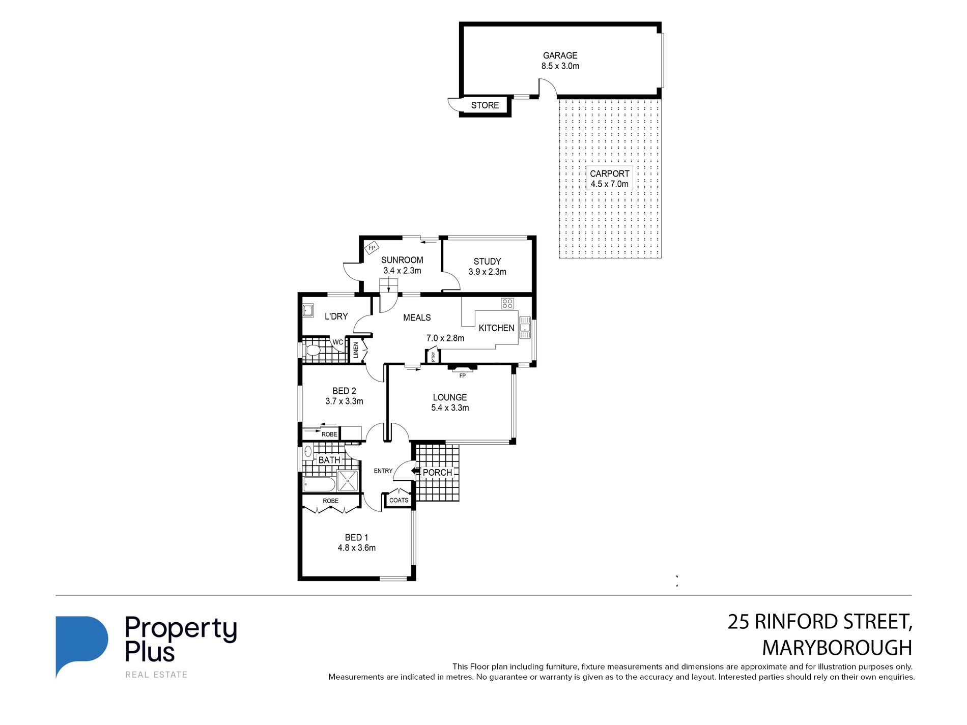 The home is light filled and inviting with the living area featuring gas heating, ornate cornices and picture rails. The kitchen is open plan as is the dining room with a near-new split system aircon. The updated kitchen has a dishwasher, gas cooking, plumbed tank water and good storage. Both bedrooms are spacious and have built-in robes; the main bedroom has plenty of room with a split system aircon. The family bathroom is well located close to the bedrooms and has a bath, shower, vanity and an IXL. The laundry is spacious with a separate toilet. At the rear of the home is another room which could be used as a sunroom, third bedroom, second living area or office, with a wood fire and built-in TV cabinet.